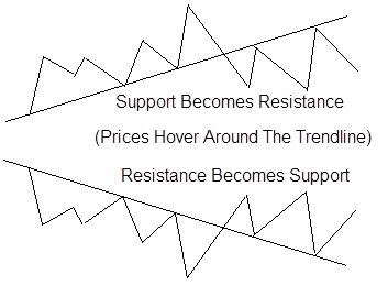 Many times you will see the trend change and the trendline will act as a magnet. The trend will reverse from up to down, or down to up. When it does, you will often see the price hover around the trendline again. In other words support becomes resistance, or resistance become support.